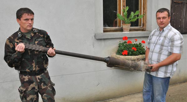 A gépágyú túlságosan mélyre süllyedt a talajba, ezért csak később került elő. Jó ideig kerítésoszlopként szolgált, majd a fenti két lelkes kutató megvásárolta - és innen már tudjuk a sorsát.